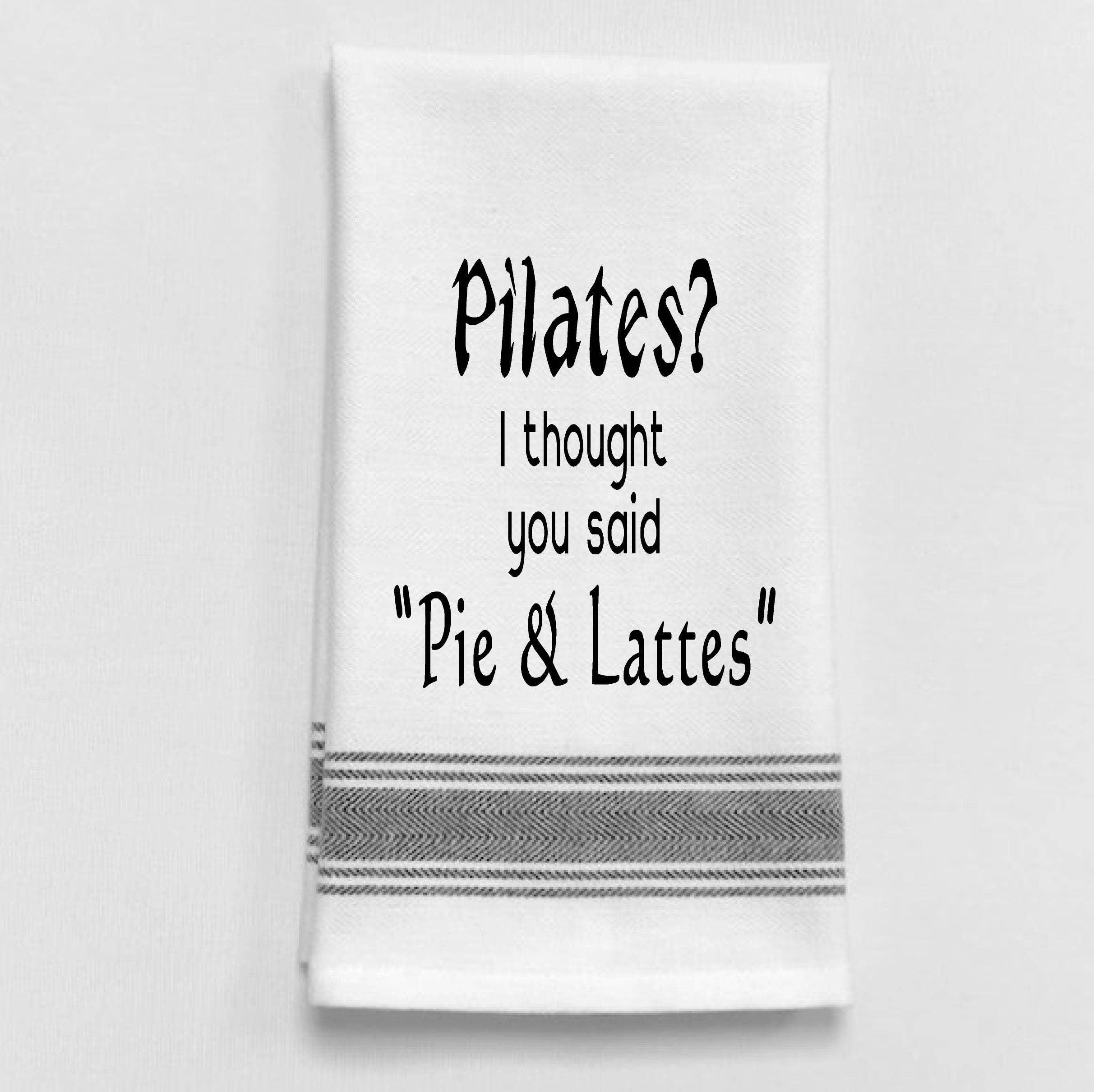 White Kitchen Tea Towel with black lined trim (BB-P-30) "Pilates? I thought you said "Pie & Lattes"" • Fun Kitchen Tea Towel • 100% Cotton Twill • 16x26 inches • Machine Washable • Not a Flour Sack • Hand Printed • Perfect gift for any occasion • Hangers available $2.00 per 10-pack Keywords: best selling tea towels, funny tea towels, screen printed towels, dish towels, funny presents, best selling funny kitchen towels, trending, funny tea towels, wine, wine gift, girlfriend gift, alcohol, KITSCH, trending, hostess gift, sassy gift