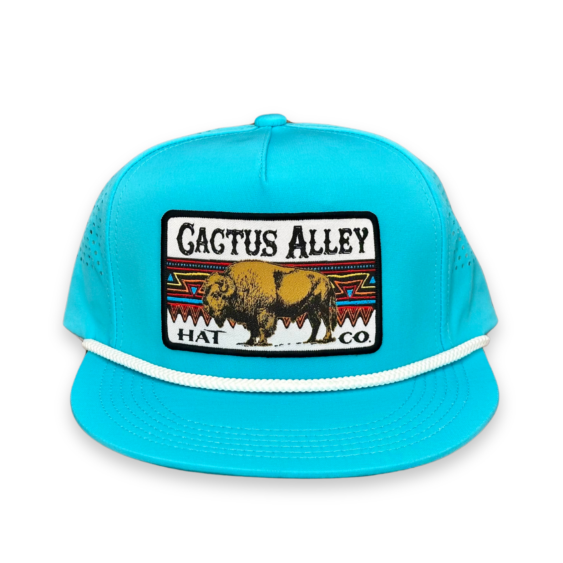 LH103-P226 5 panel, CA turquoise with white rope, featuring lasered holes in the back, and our "Indian Trail" patch!