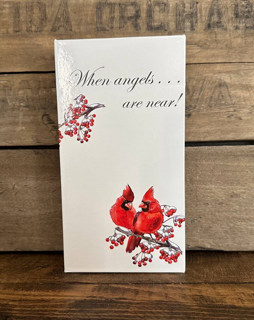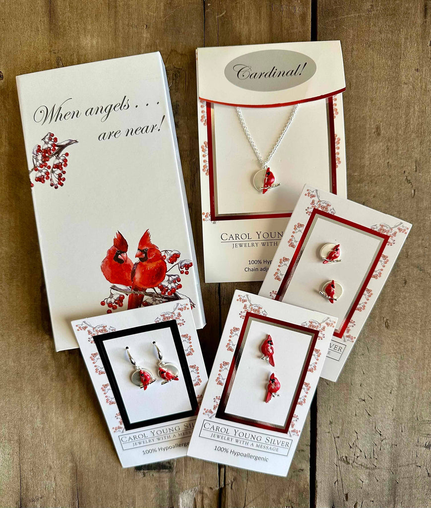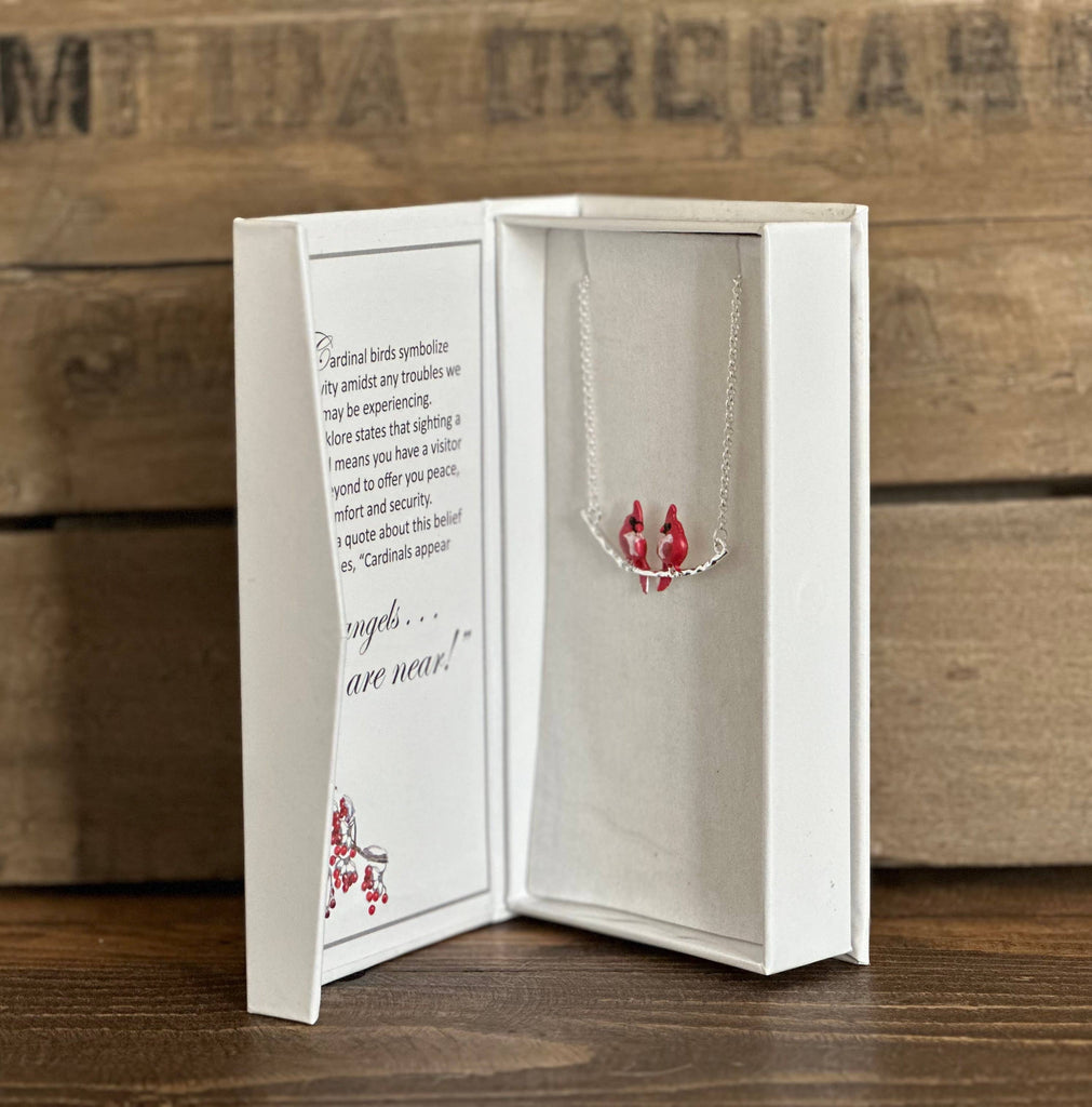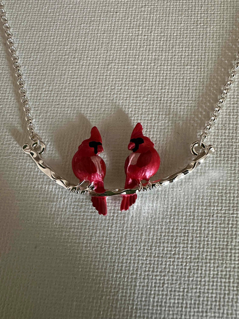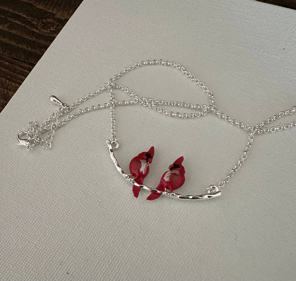 Just in! All new design featuring two realistic cardinals perched on a silver tone branch.