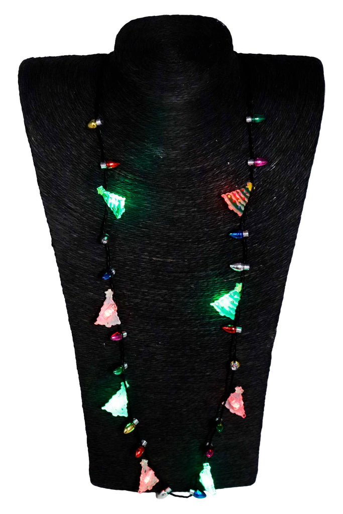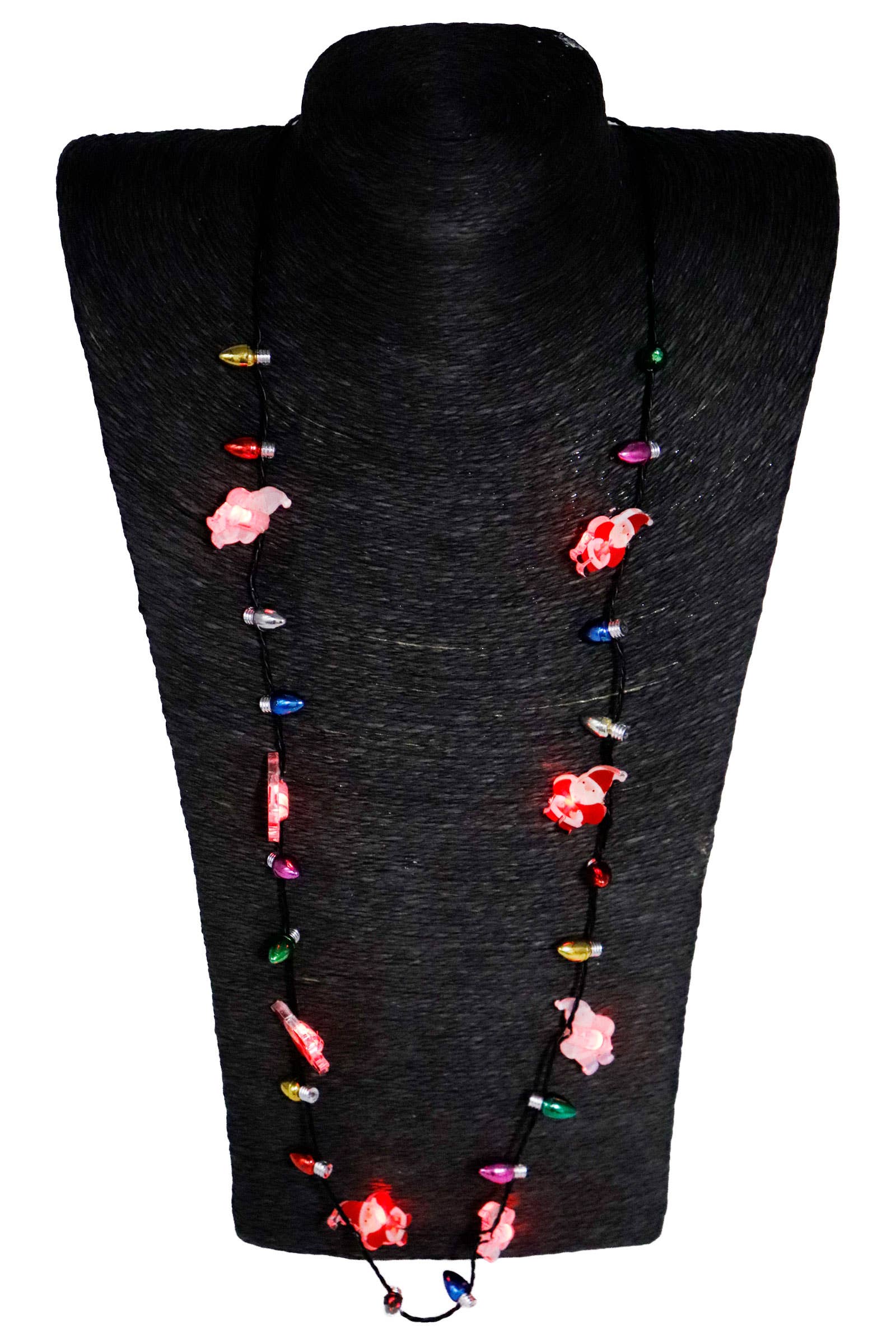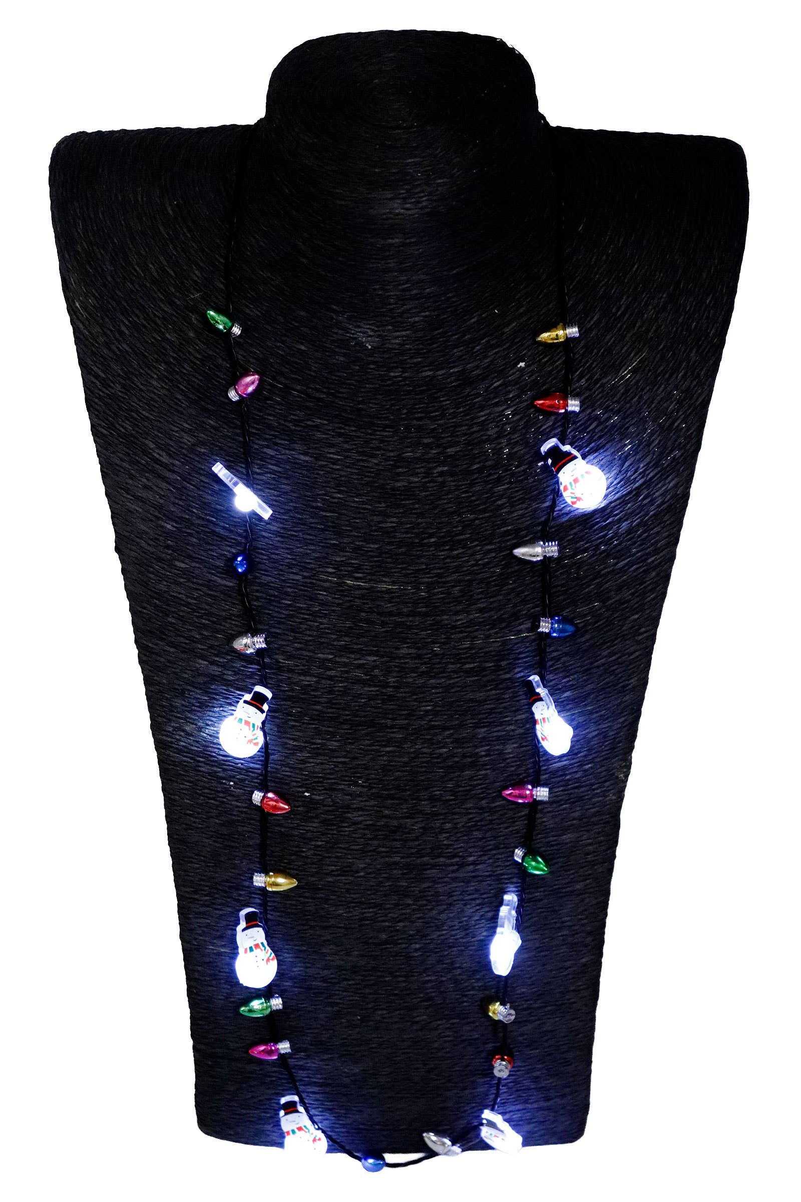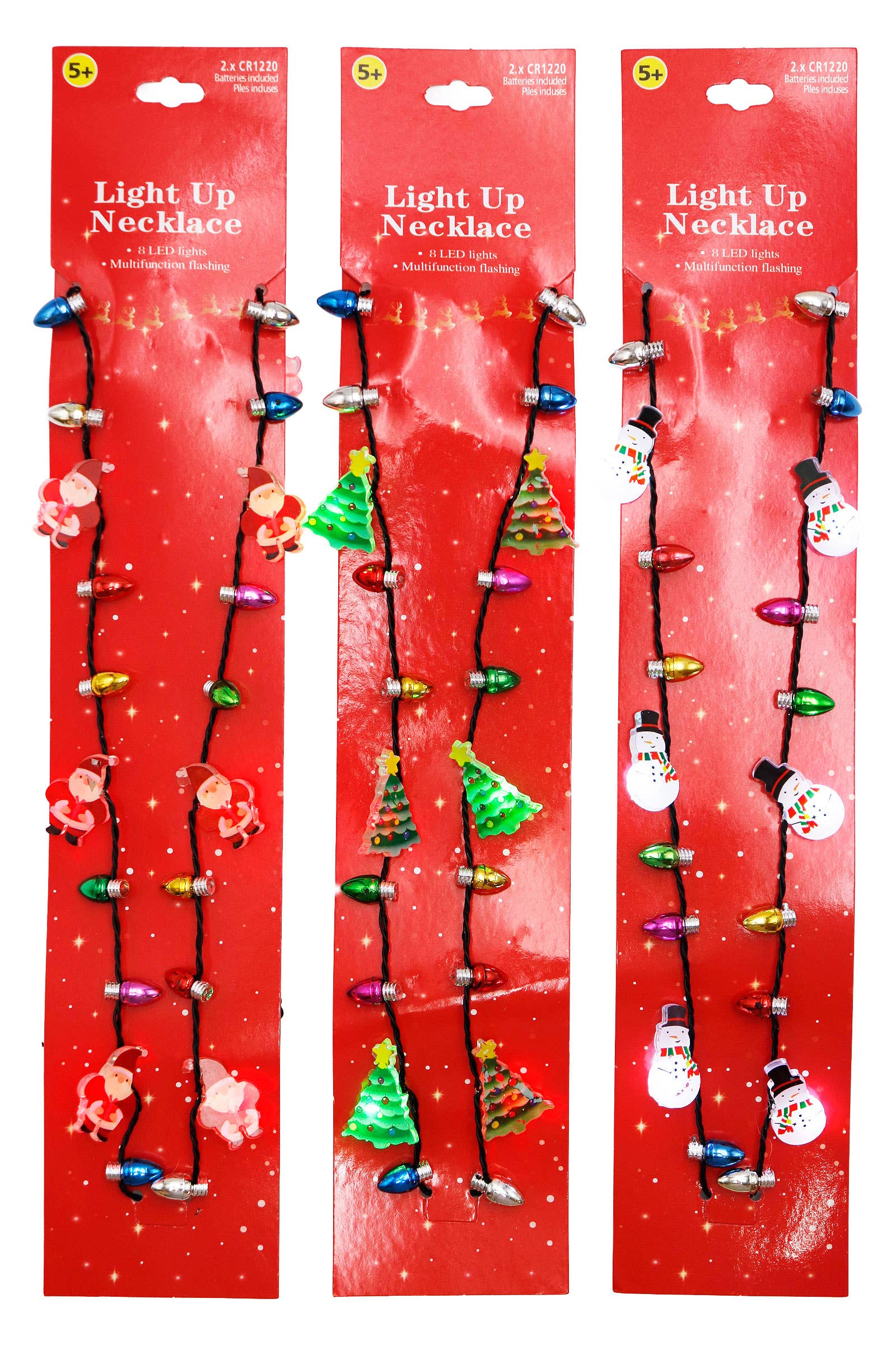 Christmas Charm Flashing LED Mini String Light Bulb Necklace -Circumference: 34" -Card Dimensions: 13" * 2.5" * 0.25" -Assorted Design (4-Snowman, 4-Santa, 4-Tree, May Vary) -6 Level LED operates on outer replaceable battery push button switch: 2 x CR1220 batteries (Pre-Installed, Please remove the pull-tab before use) -100% Plastic -CA Prop 65 Advisory -Intended for 5+ Years old -Shine bright this holiday season with our Flashing Christmas Bulb Necklace! Featuring colorful tree, snowman, santa-shaped lights, this festive necklace has 6 different flashing modes powered by 2 x CR1220 batteries (included). At 34 inches long, it’s the perfect accessory for parties, holiday parades, or Christmas celebrations. Please note: for a unique twinkle effect, the necklace only lights up every 3rd bulb.