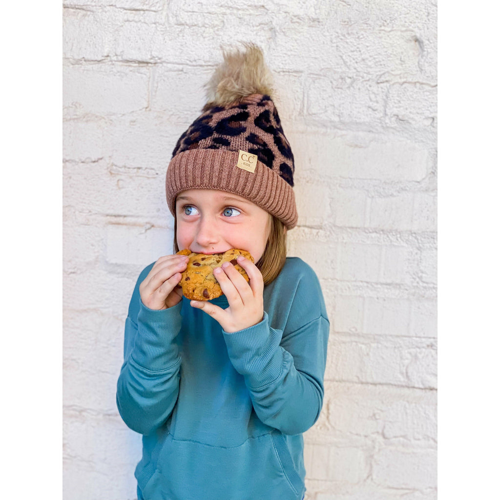 Kids Leopard Pom C.C Beanie for Children: Latte