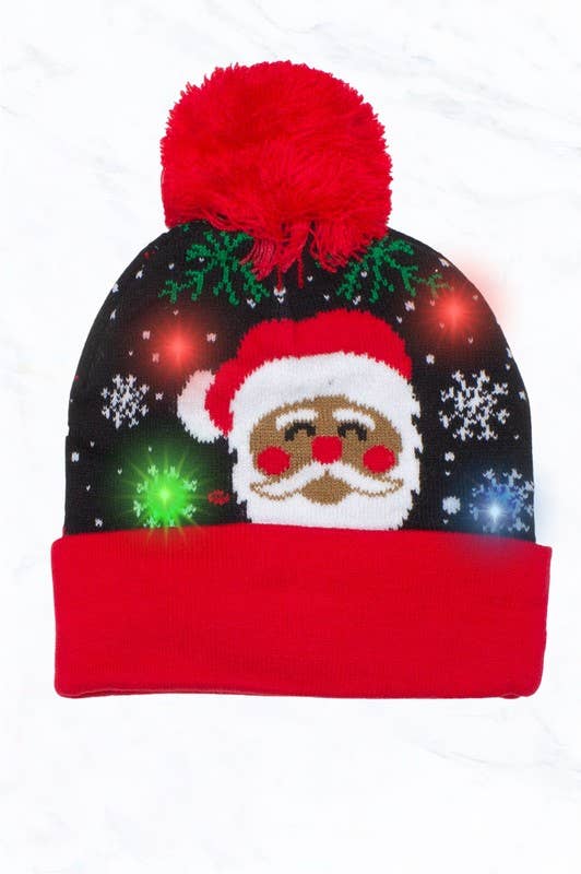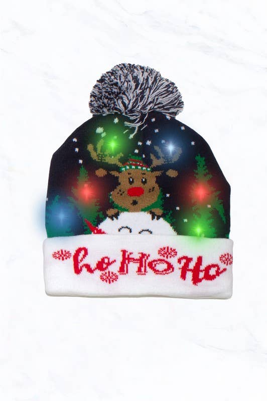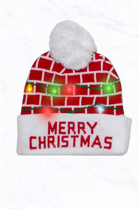 A set of festive beanies featuring colorful Christmas-themed designs and built-in turn-on lighting, topped with a soft pom-pom. Available in three designs, including a brick pattern with "Merry Christmas," a Santa design, and a reindeer with "Ho Ho Ho."