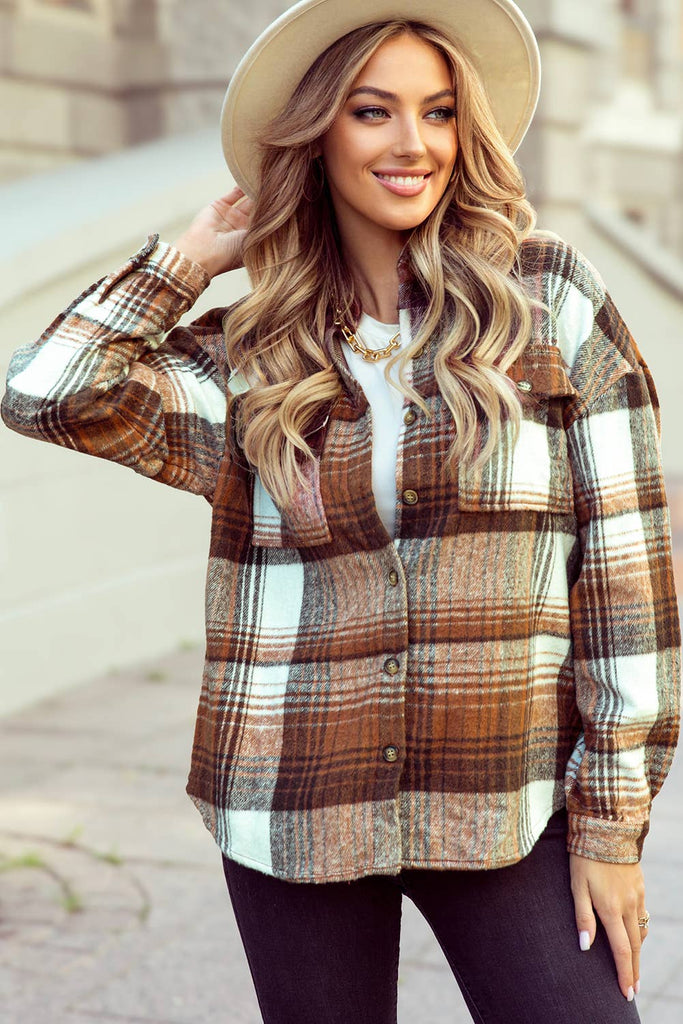 Plaid Flap Pockets Shacket: Brown / XL