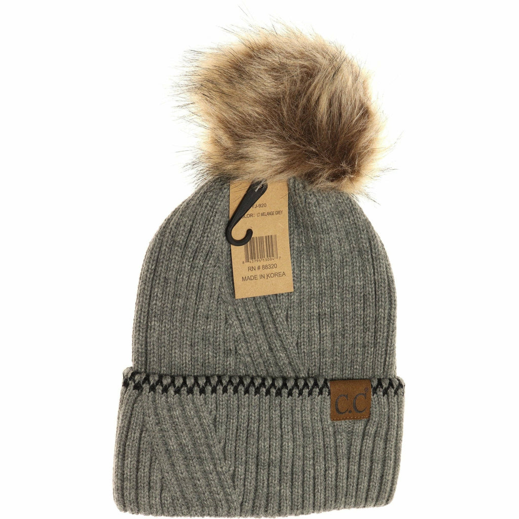 An overlapping ribbed knit with an accented cuff and a faux fur pom!  This beanie is elegant and stylish!