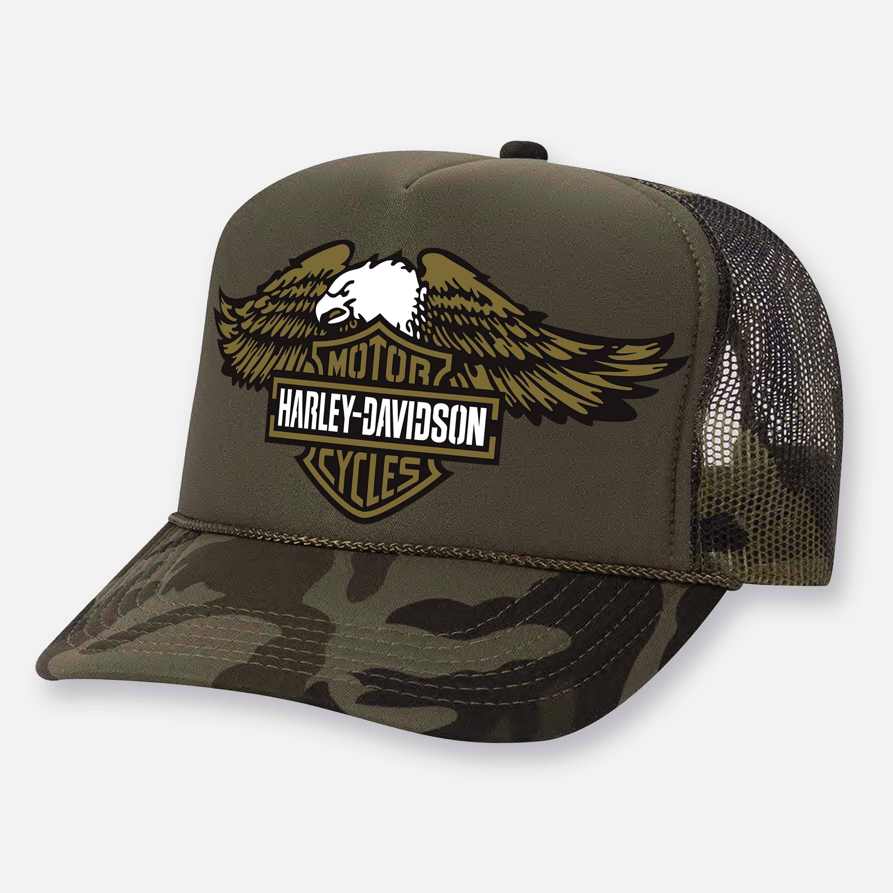 Permanantly Weld this Iron Eagle to yer dome & lets' party you beer slammin' batman! • Curved Bill trucker hat • Classic Screamin Eagle logo is printed on front foam panel • One size fits most y’all • Plenty of that long lasting deliciousness