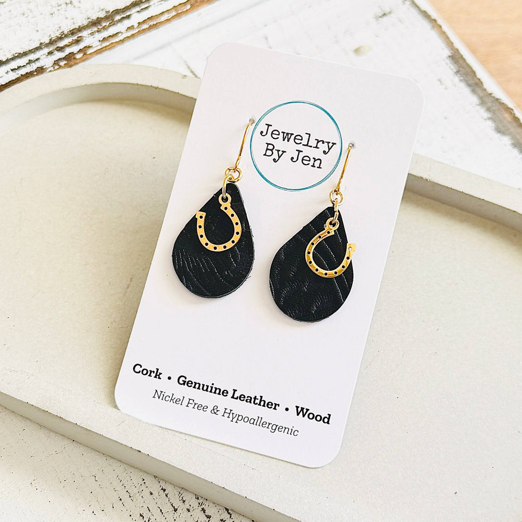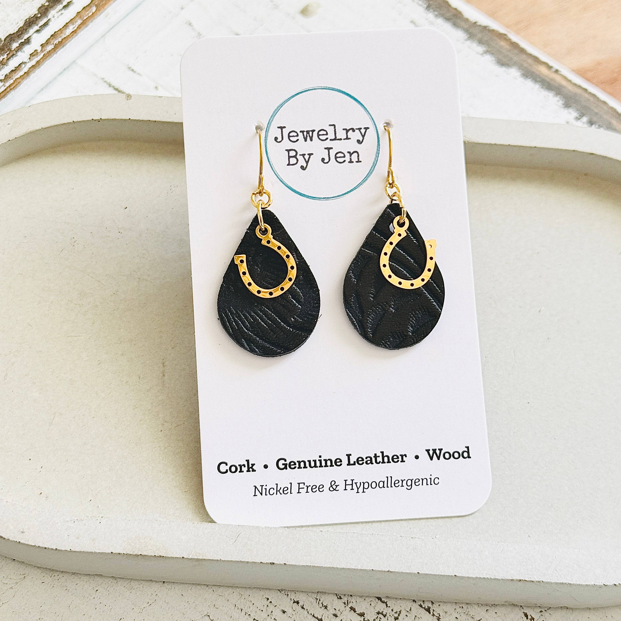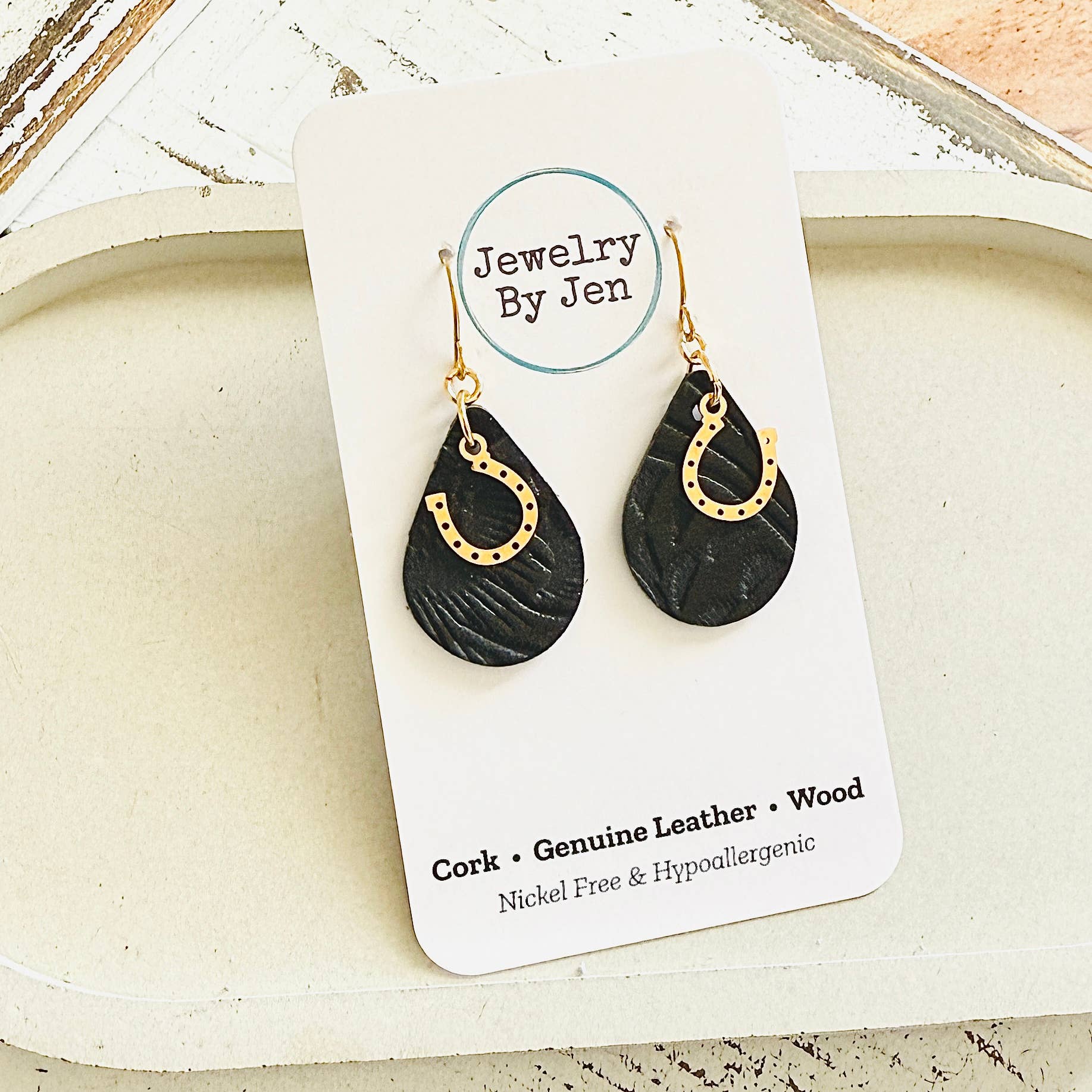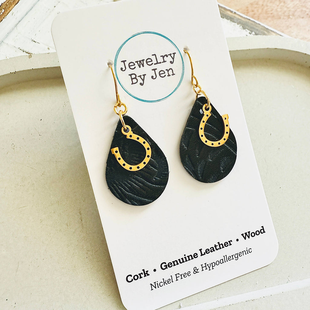 Small Teardrop Earrings: Black Tooled w/Horseshoe Charm