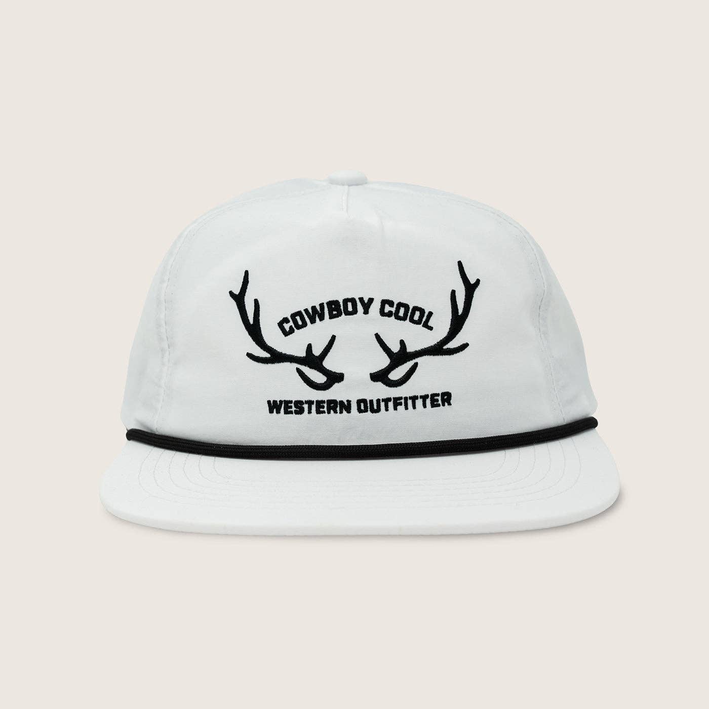 Inspired by the outdoors, this white vintage style rope snapback hat offers a perfect blend of traditional and contemporary design. The adjustable snapback ensures the perfect fit. Adorned with an embroidered design, Cowboy Cool woven label, and PVC icon tag, this hat captures the essence of a Western Outfitter.