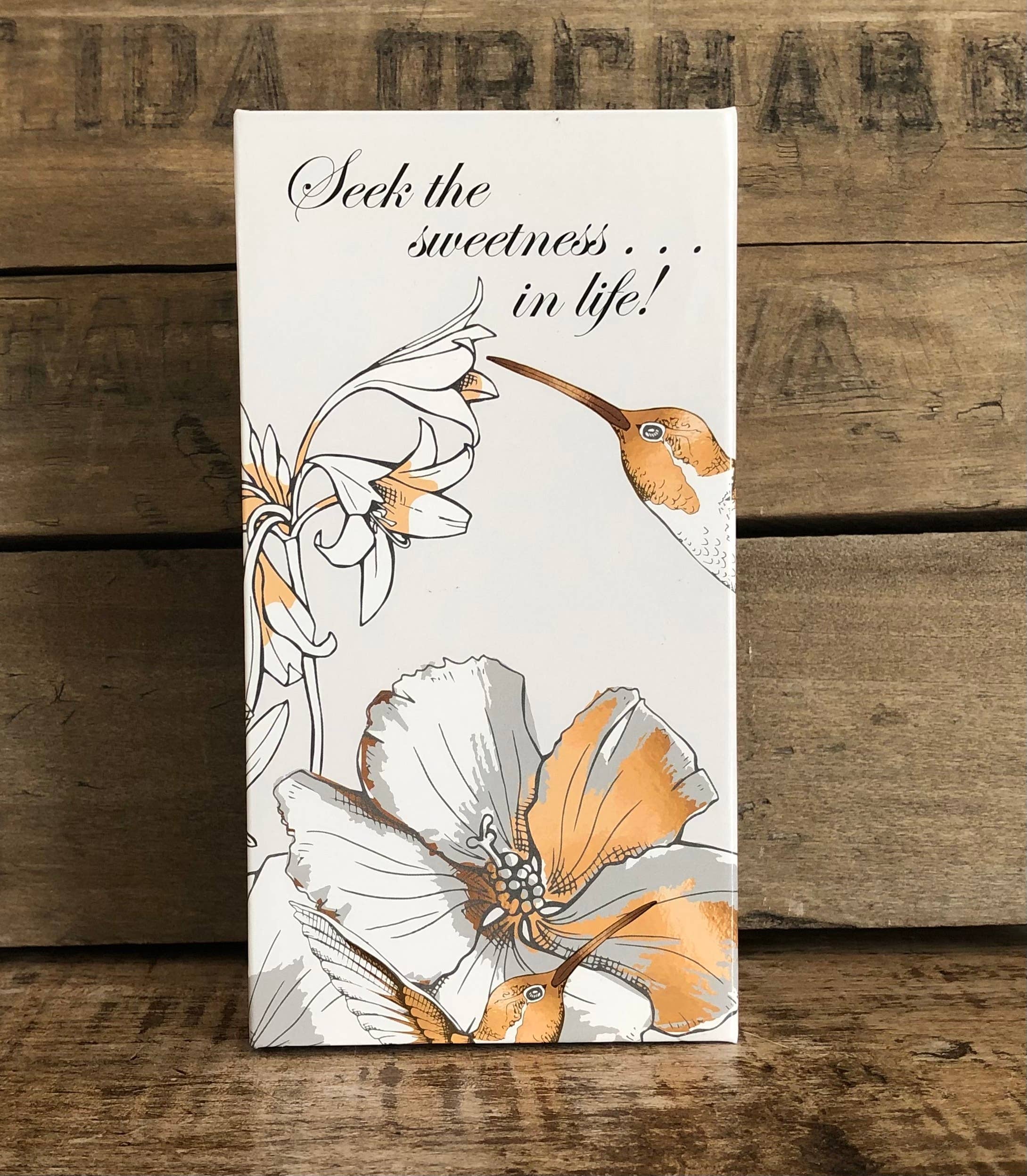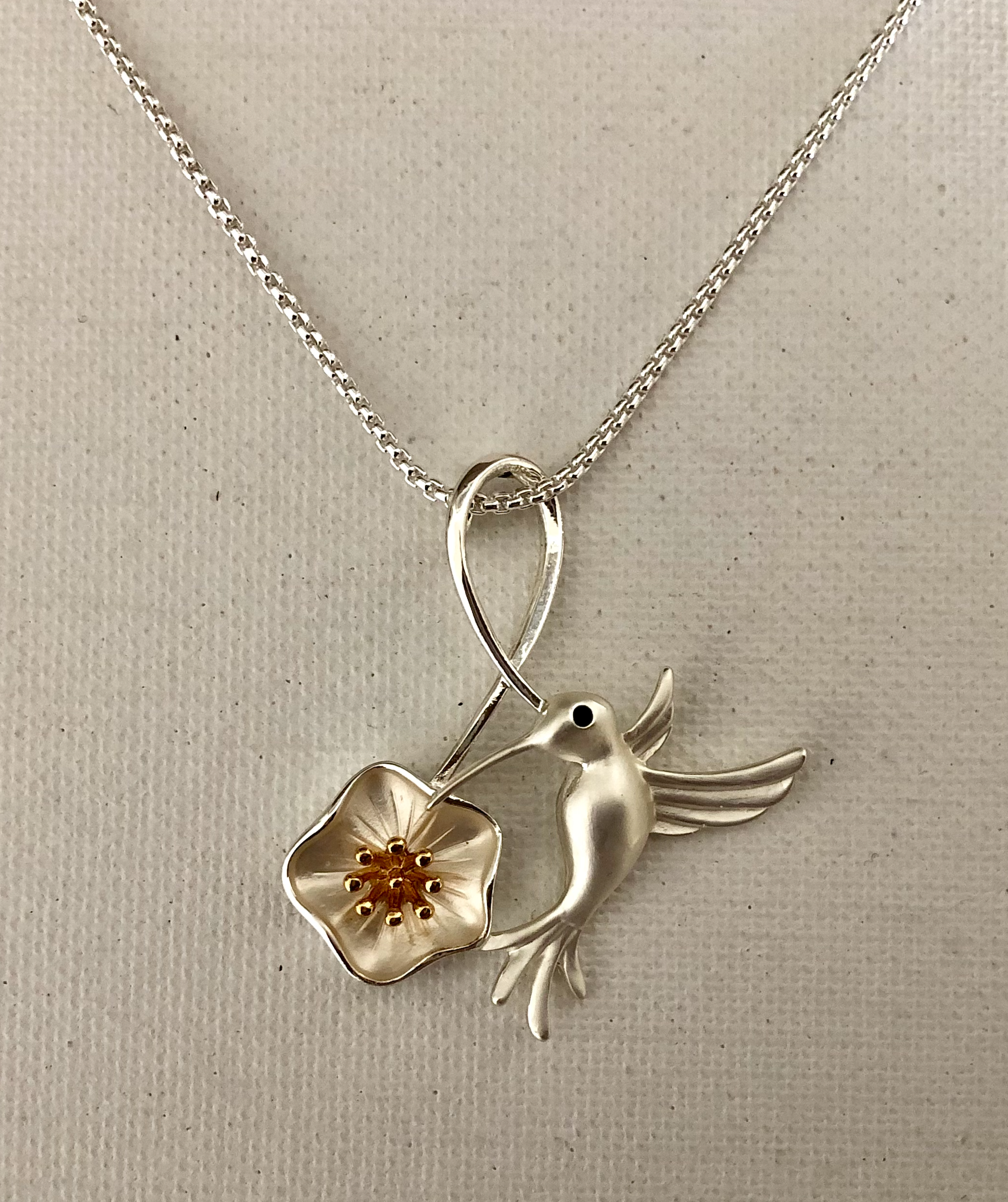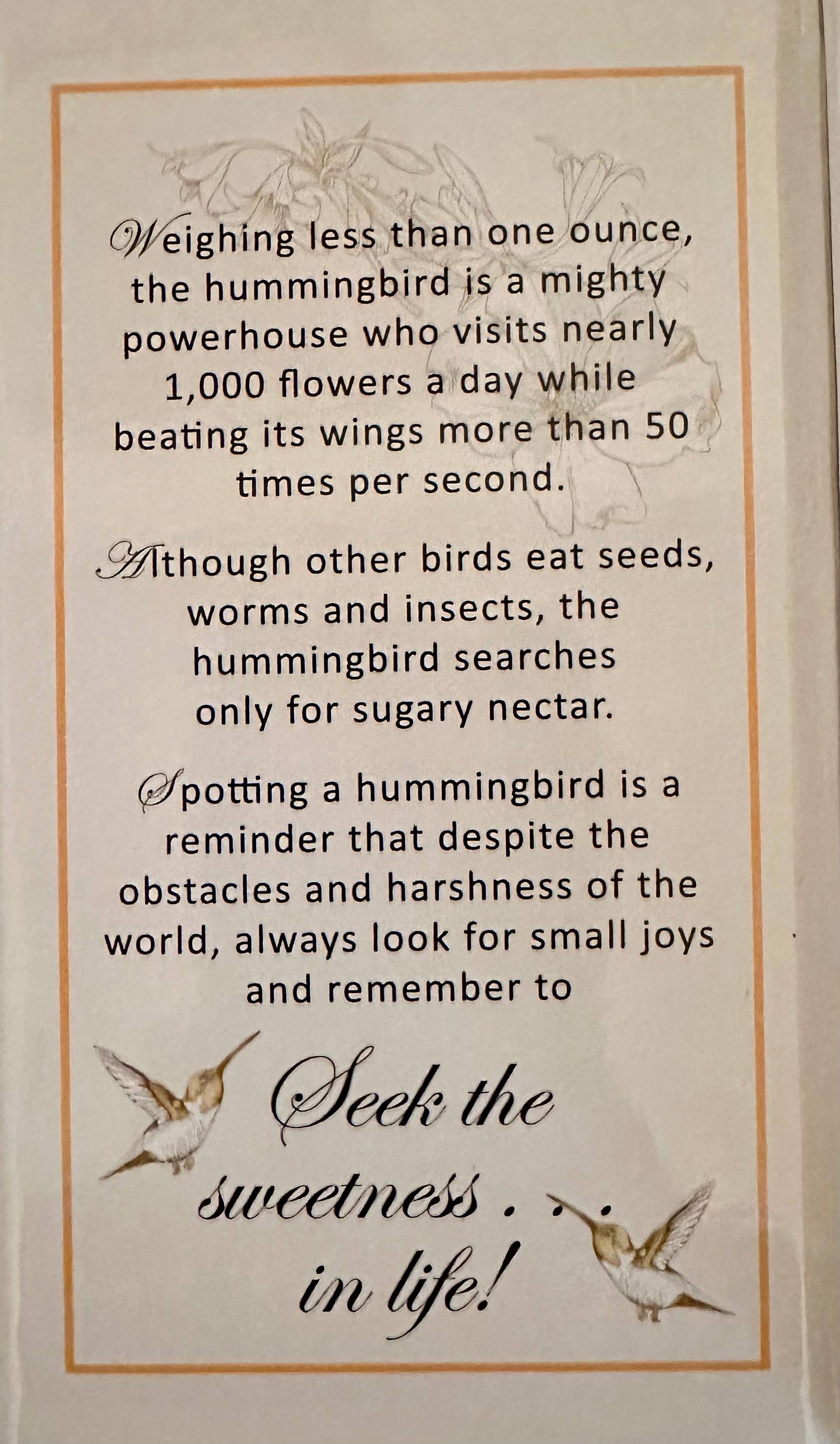 Hummingbird Necklace in Gift Box with Inspirational Message. A single, graceful hummingbird, accented with black Cubic Zirconia eye, is feeding from a beautiful hibiscus flower. The flower features a mix of gold and silver tone. A keepsake box opens up to display a verse with the tagline, “Seek the sweetness . . . in life!"